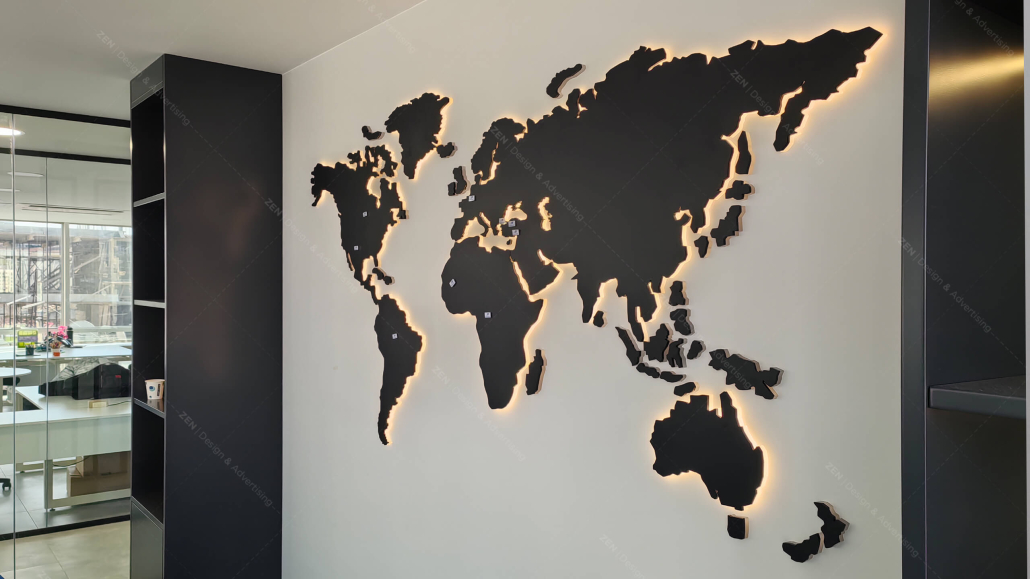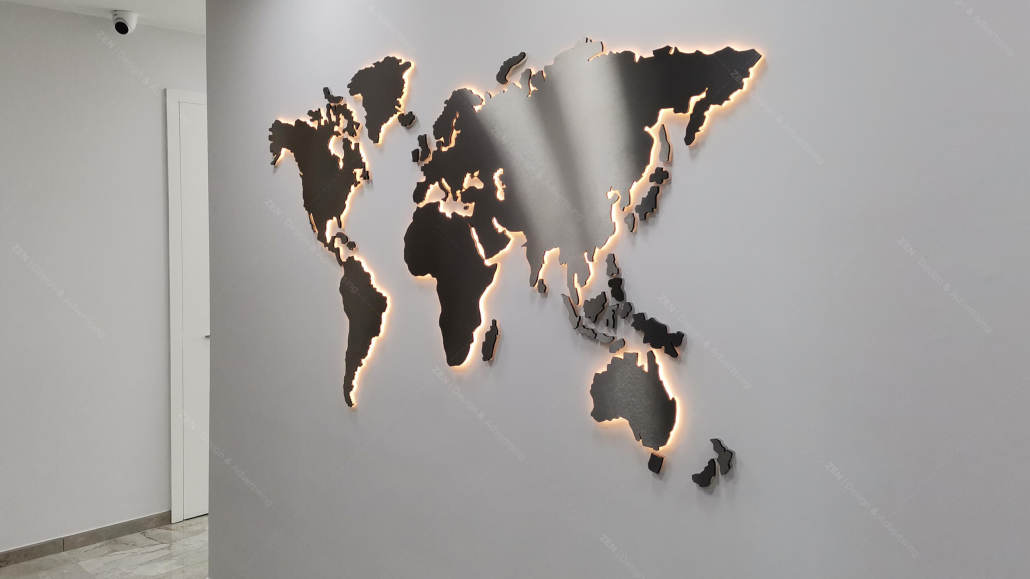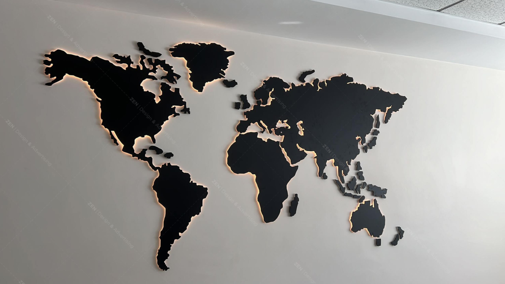 Işıklı dünya haritası; Özellikle ofis içerisinde kurumsal firmaların kullandığı işlevli ve dekoratif bir uygulamadır. Bayi veya temsilcilikleri olan bu kurumsal firmalar harita üzerinde manyetik logolar ile temsilciliklerini veya bayilerini belirtebilmektedir.